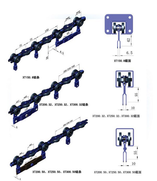 軌道采用開口方鋼管制造,具有外型美觀,運(yùn)動部件不外露等特點(diǎn),除了提高鏈條本身的防塵、防污性能外,同時也減小了因偶然事件造成的觸及、刮破鏈條等故障,加強(qiáng)了安全性。